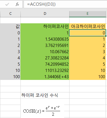 엑셀 함수 중 ACOSH 함수는 아크 하이퍼볼릭 코사인 함수로 쌍곡선 함수입니다.