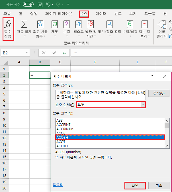 단계 1. 툴 바의 함수 삽입 버튼을 클릭한 후 함수 마법사 창에서 ACOSH를 선택한 후 확인 버튼을 클릭하세요.