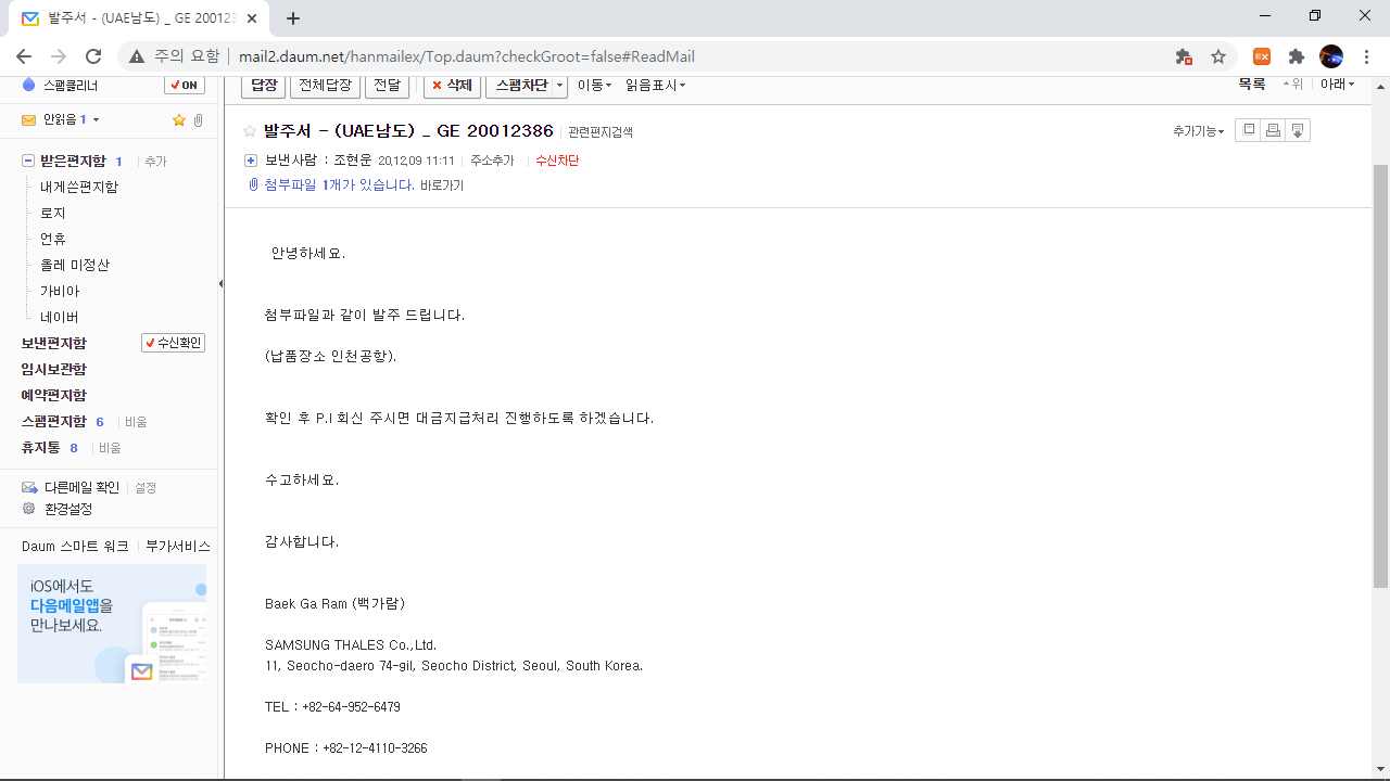 방금 메일을 확인하였는데 모르는 곳에서 발주서가 와 있네요.